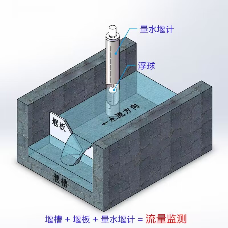 量水堰计由磁杆、浮球、测量电路和不锈钢护筒组成。当堰槽内水位发生变化时,会带动浮球产生液位差,上位机用当前液位减去校准的基值得到实际的堰上水位,再根据堰槽类型计算流量。